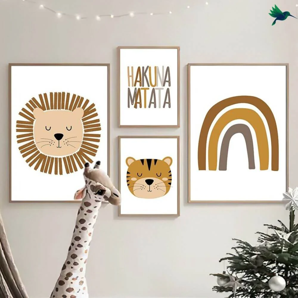 Ces affiches décoratives sont aussi idéales pour ajouter une dimension ludique à sa chambre ou à sa salle de jeu. C’est une bonne idée pour inspirer les enfants à développer leur imagination et à découvrir le monde qui les entoure. Nos images représentent un lion, un tigre, une girafe, un arc-en-ciel et l’inscription “Hakuna matata” qui signifie “Pas de souci”.