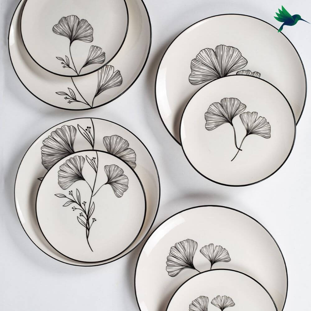 Élégantes, raffinées, ces assiettes ont un design exotique et singulier. Céramique blanche, liseré noir, motif feuilles de Ginkgo. Ce sera une façon audacieuse et artistique de rehausser la présentation de vos aliments. C’est la pièce parfaite pour n’importe quelle cuisine, salle à manger. Le noir et blanc en fait une assiette polyvalente qui s’associe avec tout.
