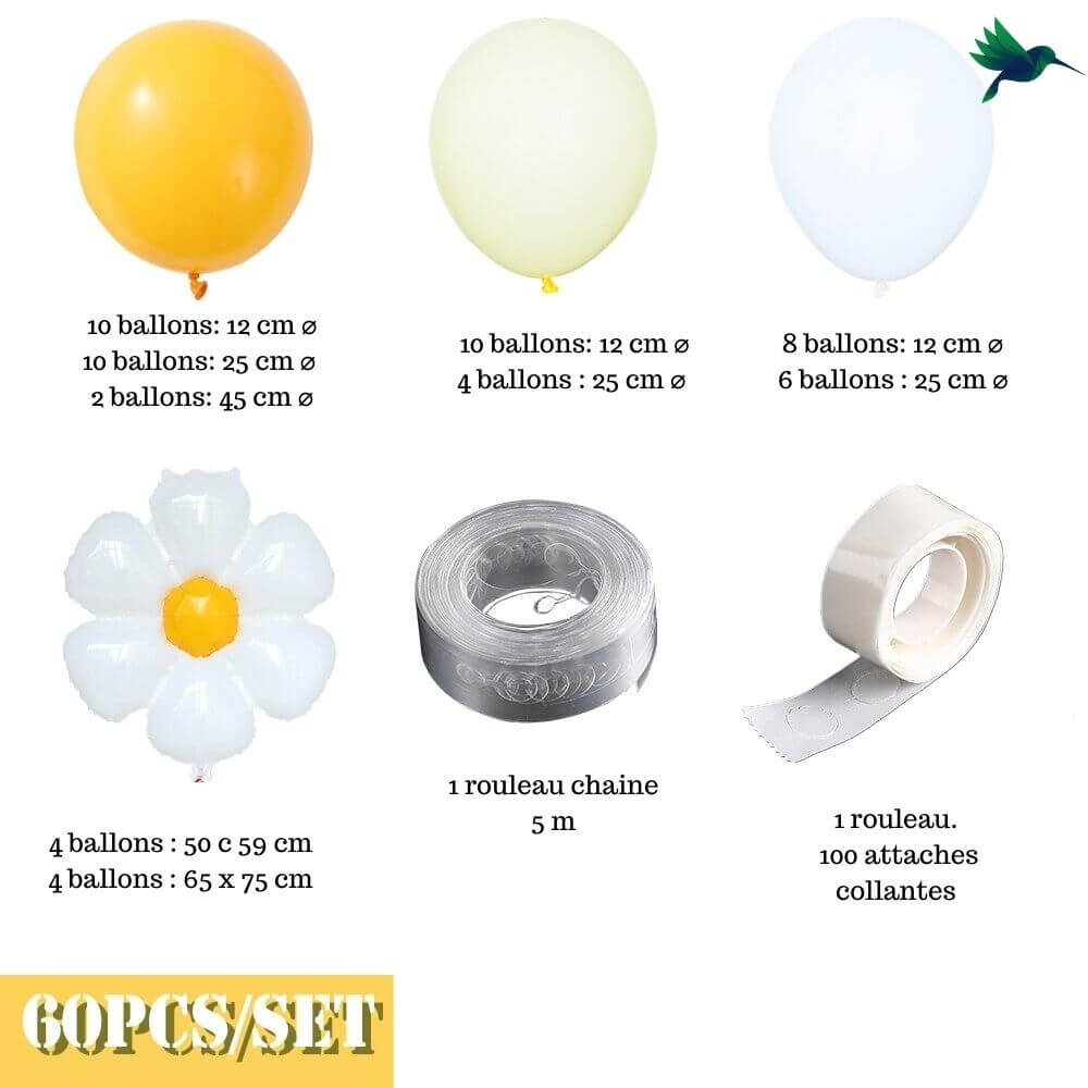 Rendez la fête plus animée en ajoutant un bouquet de Ballon marguerite ! Ce lot permet de créer une arche de ballon dans les couleurs jaune et blanche. Ces coloris frais apportent une touche de gaieté et de fraîcheur, un vent printanier s’invite !