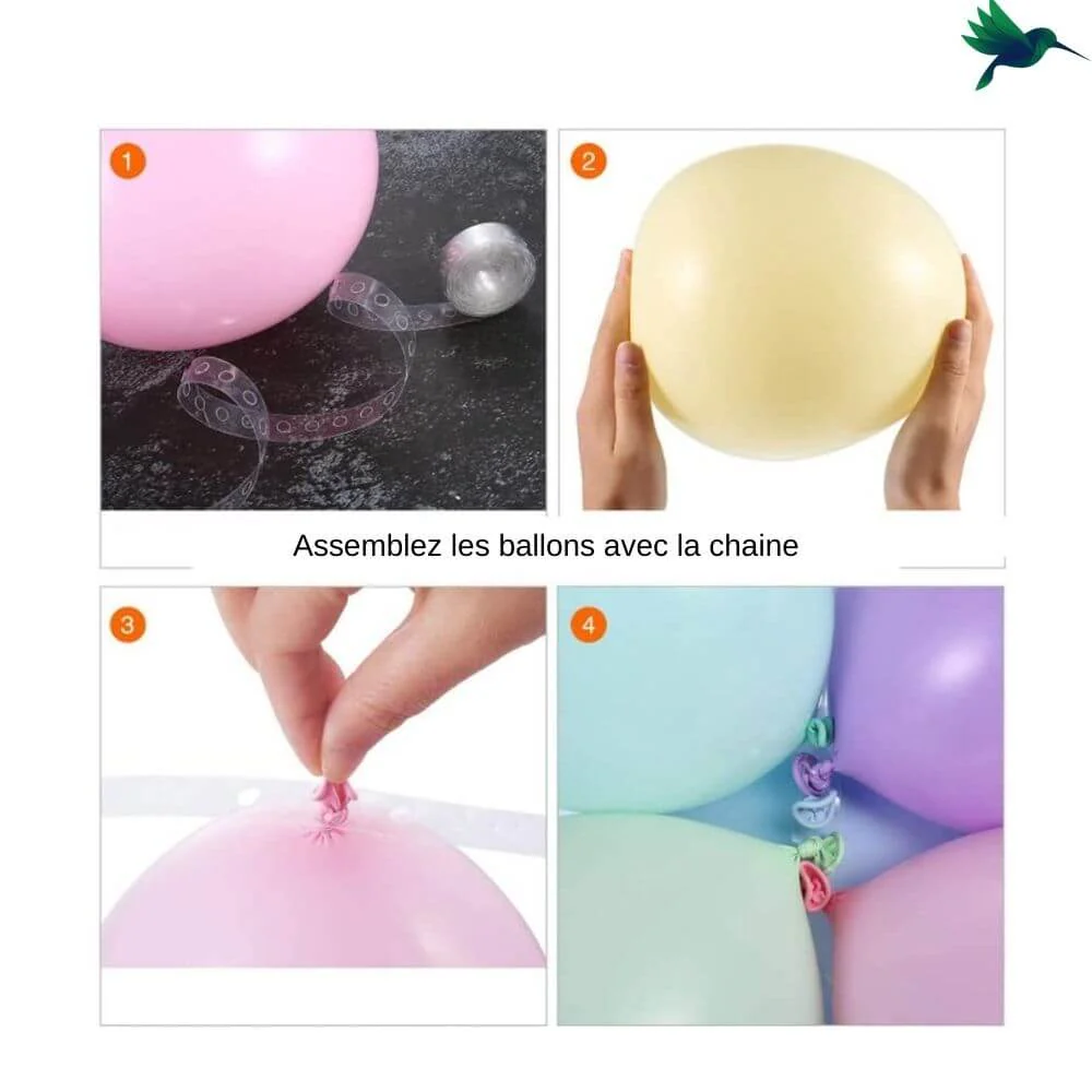 Notre lot comporte tout ce qu’il faut pour créer facilement votre arche de ballons ! Si nécessaire, nous vendons également une pompe à ballons dans notre boutique, gagnez du temps et de l’énergie.