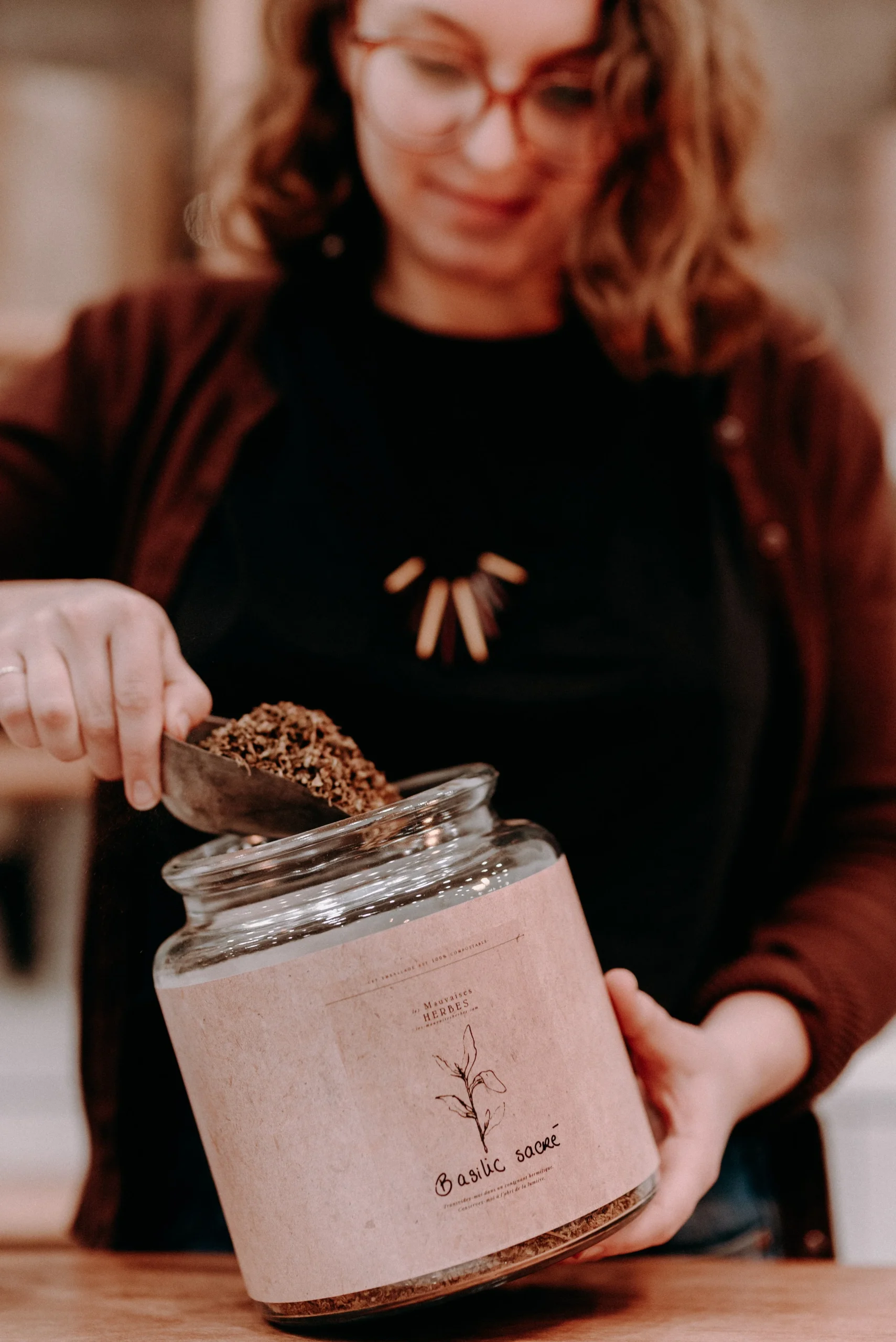 Pour plus d’information sur l’utilisation médicinale du basilic sacré en interne, réfère-toi à un·e herboriste thérapeute accrédité·e.