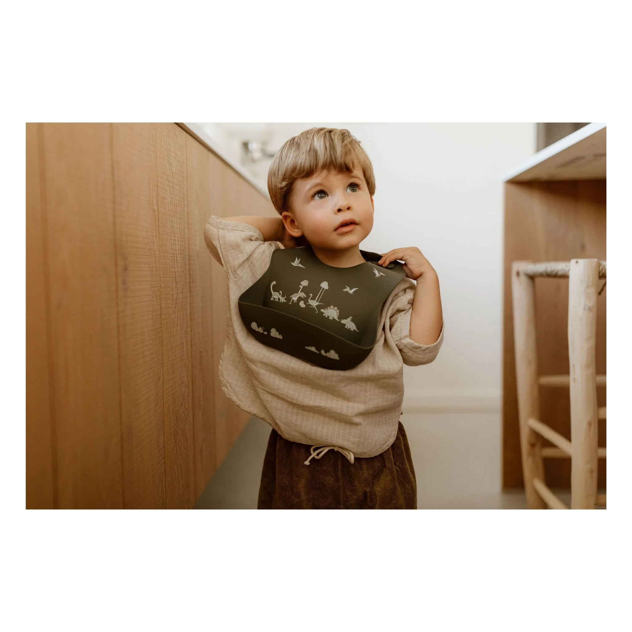 Pour garder les vêtements de votre bébé propres durant ses repas, notre joli bavoir “Dinosaures” aux teintes douces est idéal.