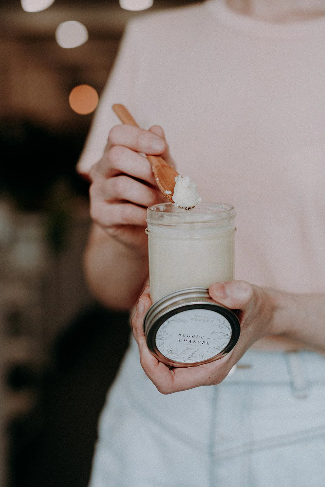 Enfin, une alternative locale aux beurres végétaux! Le chanvre ne produit pas naturellement de beurre, mais on peut tirer de ses graines une huile très riche qui nourrit en profondeur. On l’adore pour le soin des peaux déshydratées, sèches et/ou matures. L’huile fine est ensuite mélangée à une base de beurre de soya, offrant un produit délicieux pour la peau, s’utilisant de la même manière que le karité ou le beurre de mangue.