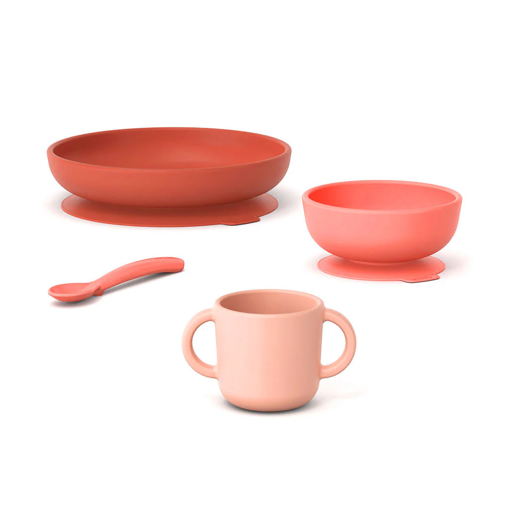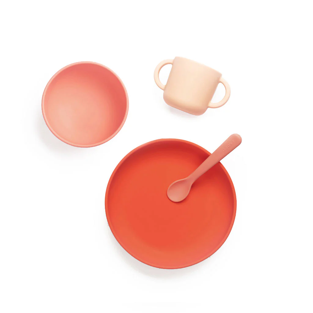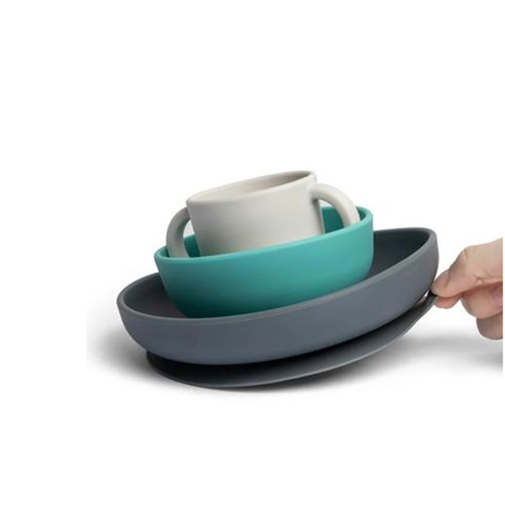 Le set de vaisselle bébé en silicone résiste à tout: à bébé, aux chocs, au freezer, au four et micro-ondes et au lave-vaisselle!
