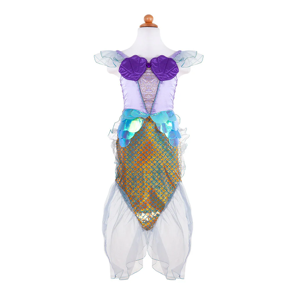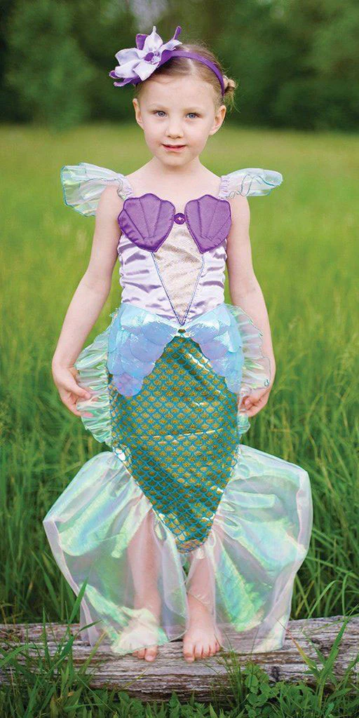 Ce costume de sirène très élaboré enchantera votre fille. Il est facilement ajustable grâce aux bretelles élastiques, des smocks au dos et du spandex au niveau des hanches.