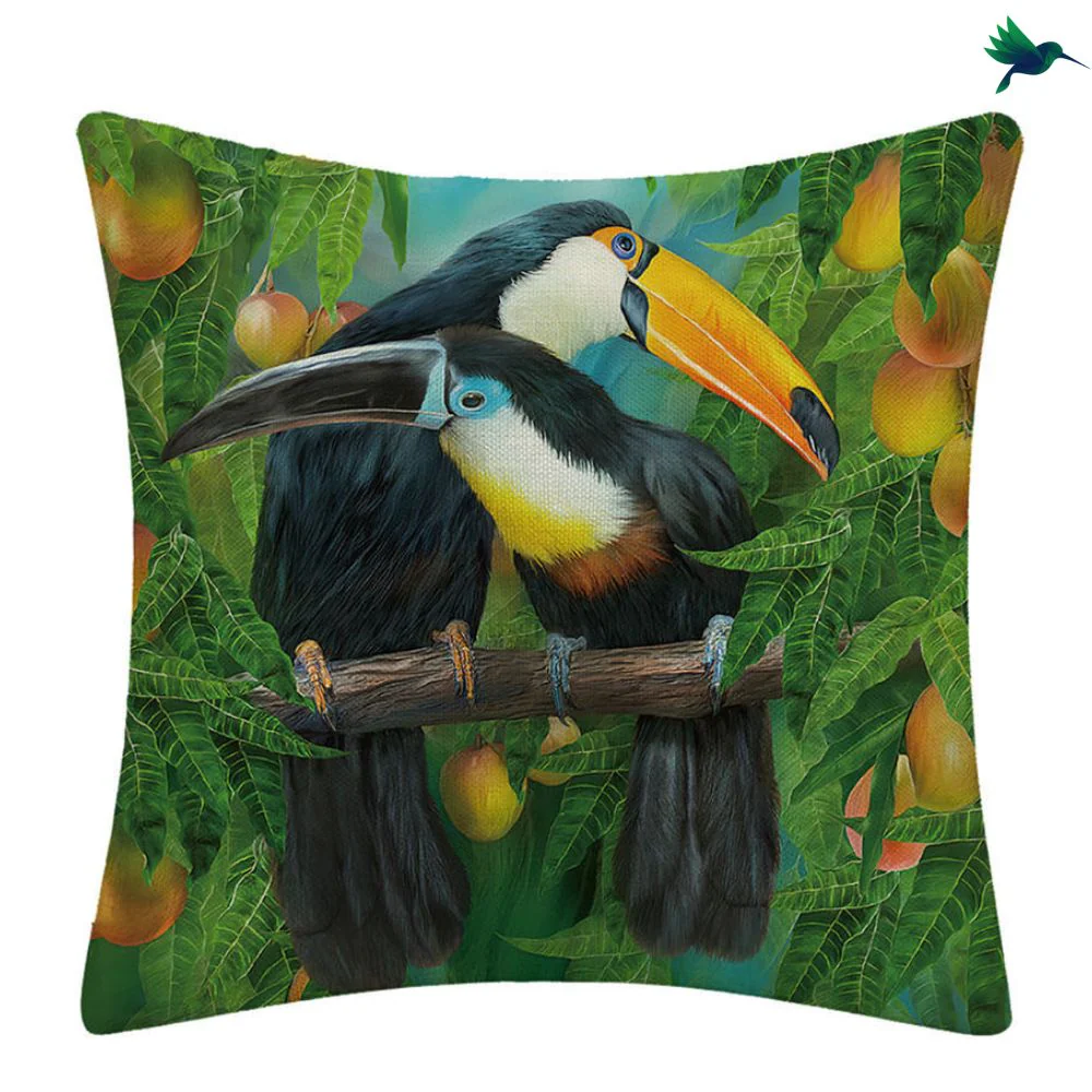 Le coussin Couple Toucan souligne la couleur verte naturelle de la végétation d’une foret tropicale.