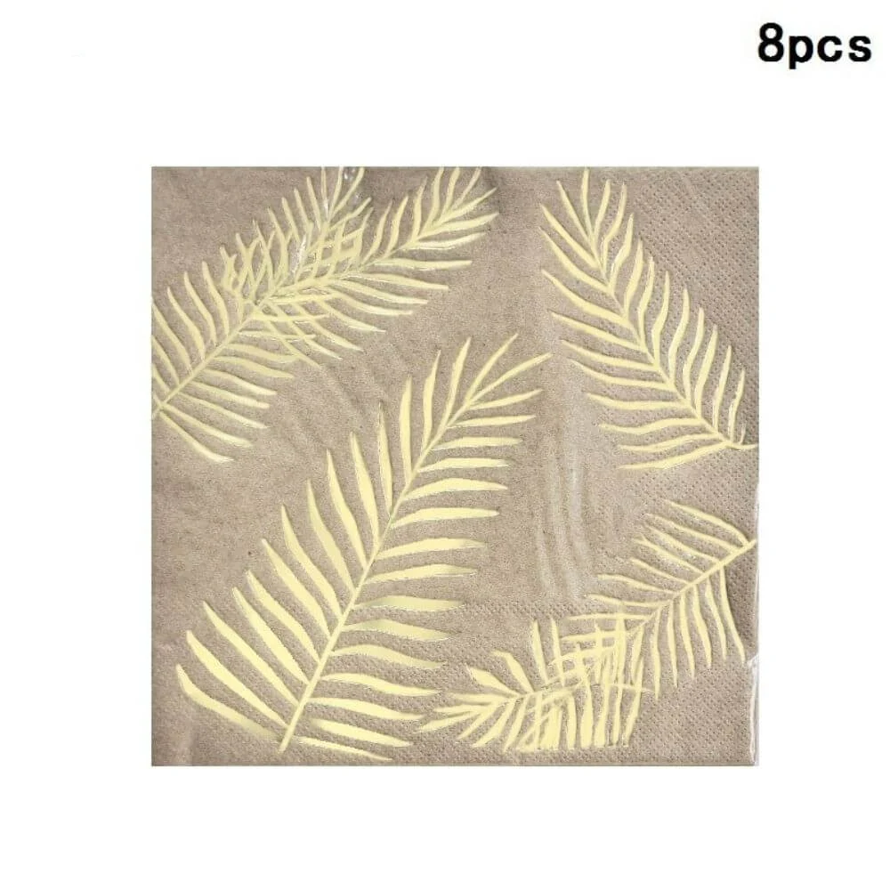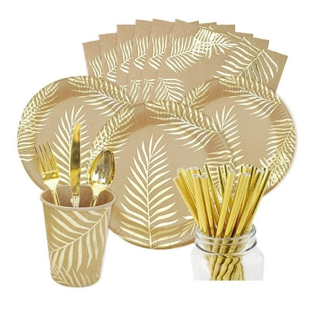 À la fois simple, élégant et chic, cet ensemble de vaisselle apportera une touche dorée et lumineuse. Nous mettons à votre disposition des assiettes, des gobelets, des pailles dorées, des serviettes de table, et des couverts dorés. Le tout joliment orné de feuilles de palmier. Très tendances, ces motifs sont incontournables pour une Déco Anniversaire Tropical Doré.