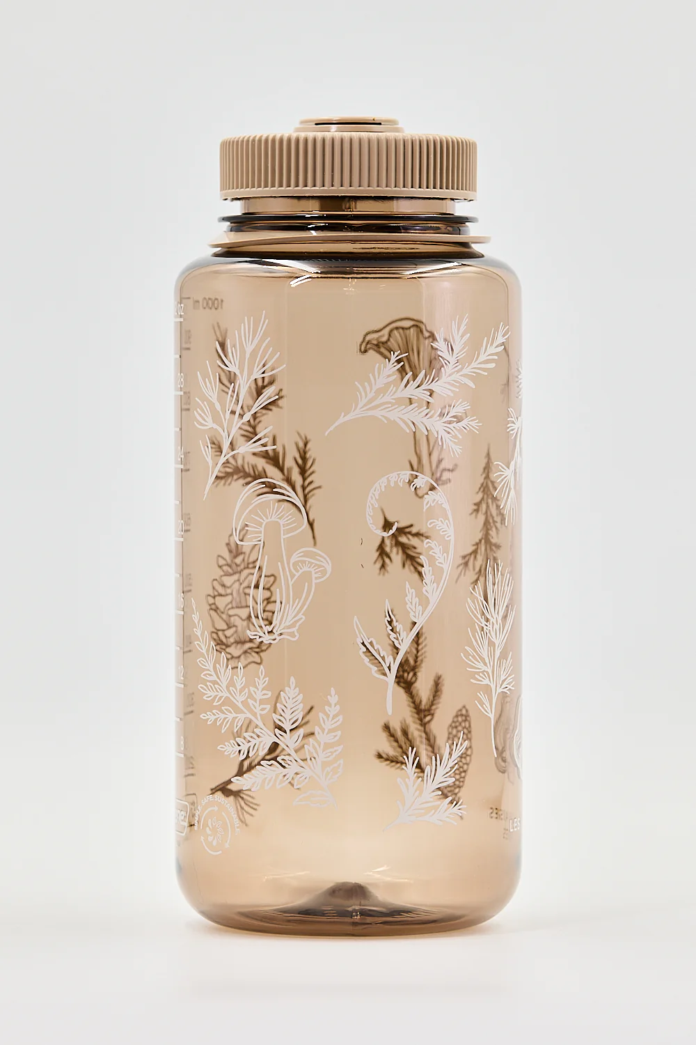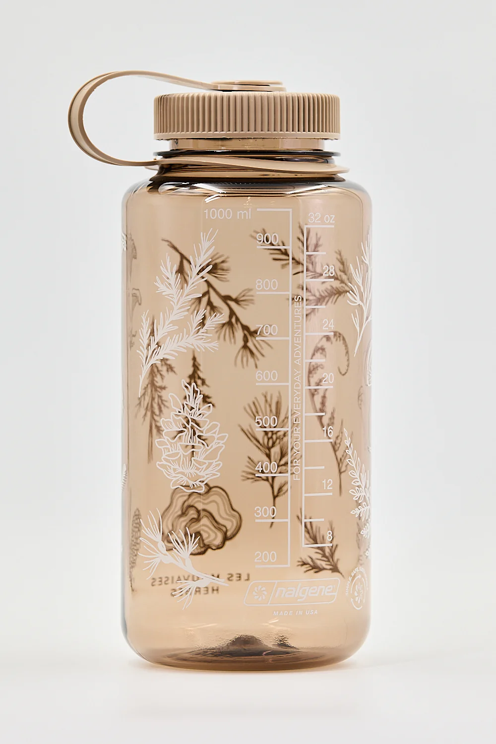 Étanche ta soif avec une gourde Nalgene à notre image, parcourue de sapin baumier, de mélèse, de pin blanc, de chanterelles et de cocottes de pin rouge.