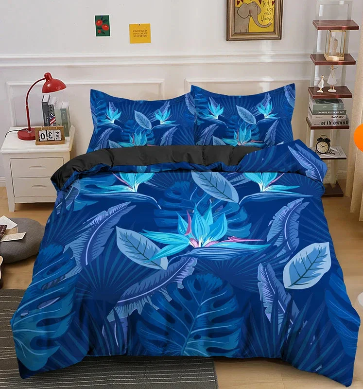Dans la chambre, cette housse de couette fleurs bleues crée une atmosphère tranquille et sereine. Ces motifs de feuilles de palmier et autres plantes exotiques, sont une excellente idée pour créer un environnement relaxant dans lequel vous pourrez dormir confortablement.