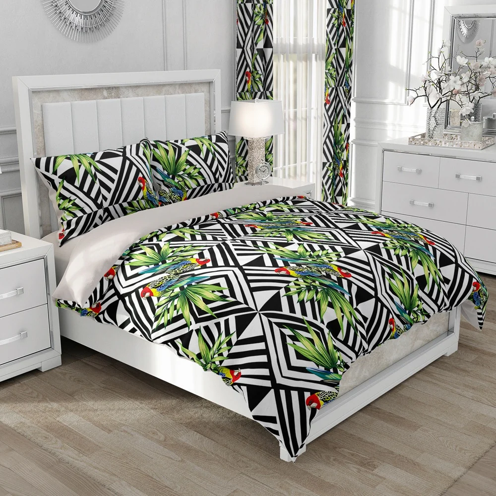 Cette Housse de couette tropicale avec son magnifique motif perroquet coloré style ara et son arrière-plan design géométrique en noir et blanc apportera une touche d’exotisme et de nature à votre chambre à coucher.