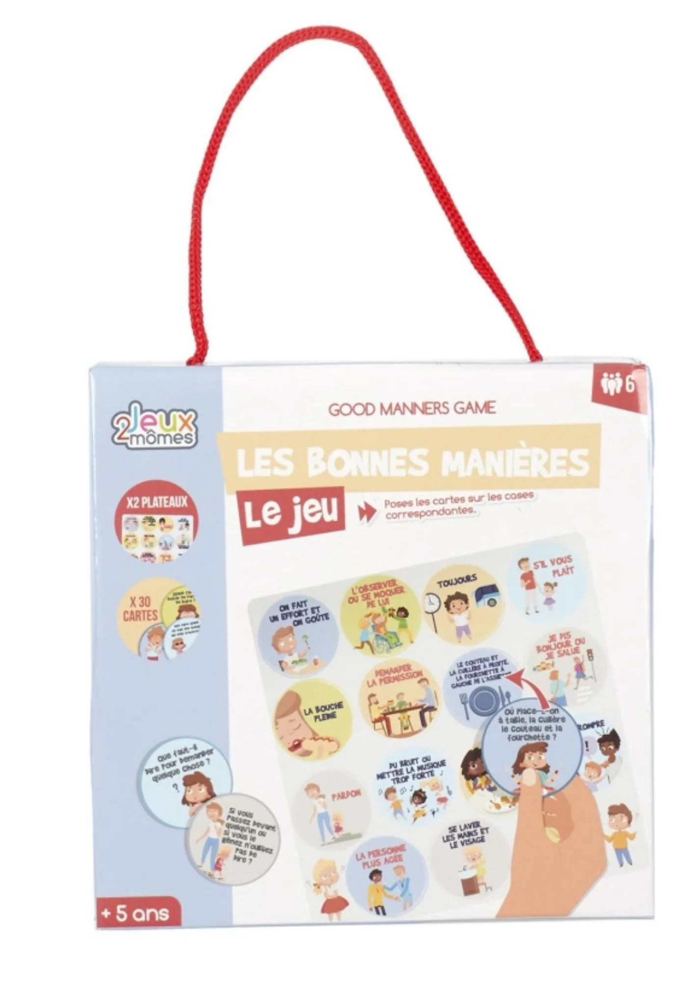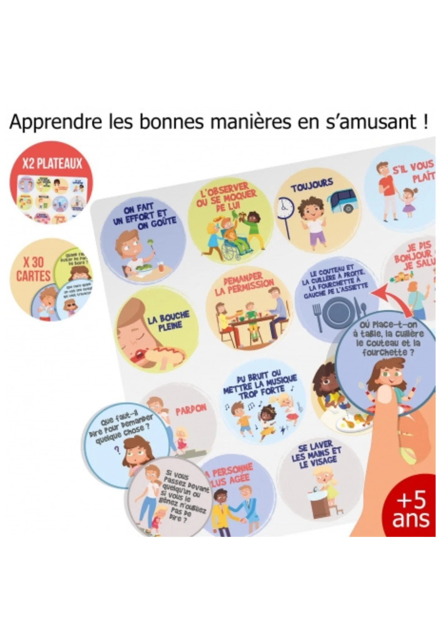 Jeu de 30 cartes pour exercer les bonnes aptitudes sociales. Le but : trouver les cartes correspondantes aux cases des bonnes manières inscrire sur le plateau de jeu. Grâce à ce jeu inspiré de la pédagogie Montessori, les enfants apprennent les bonnes manières de se comporter de façon ludique sana contrariété tout en s’amusant.