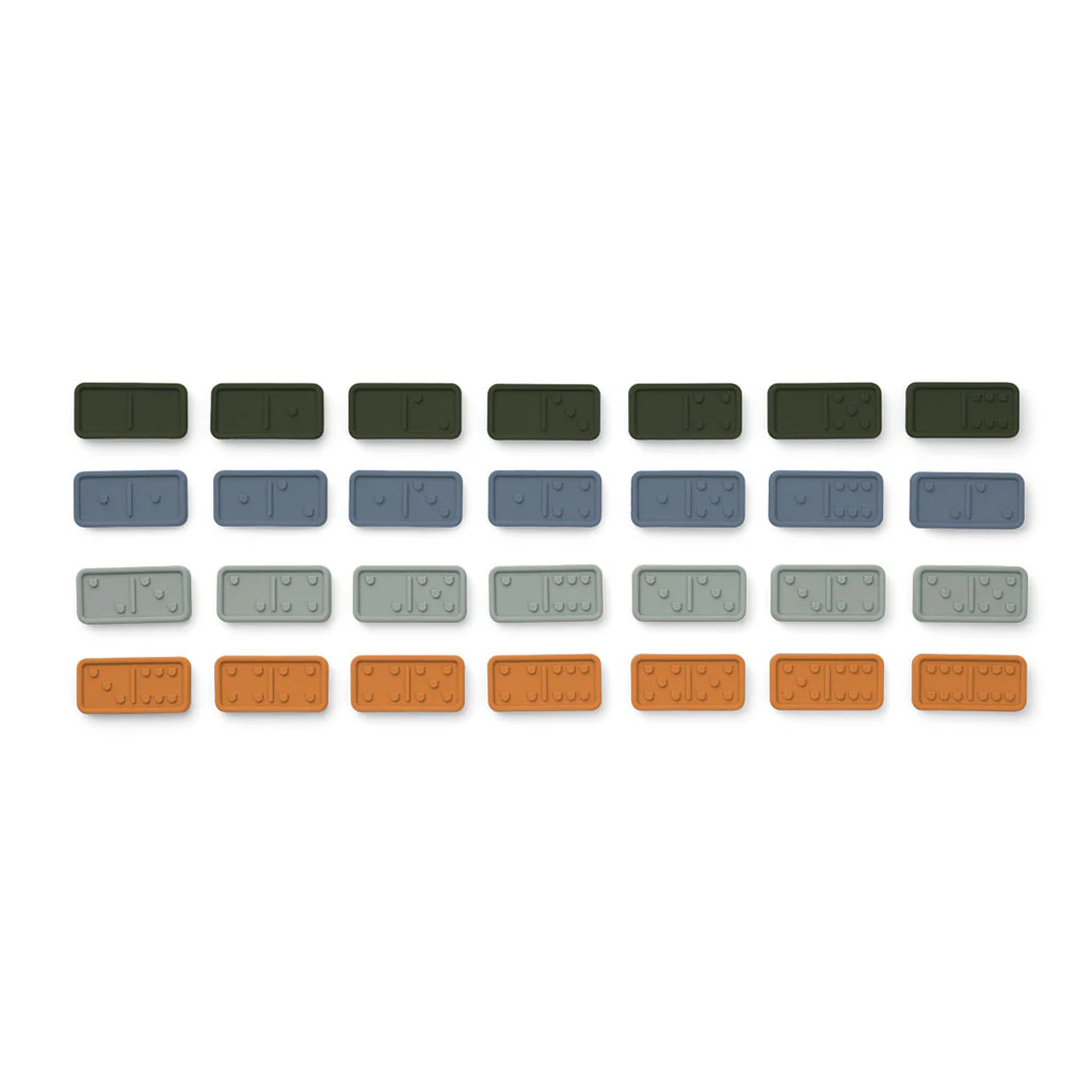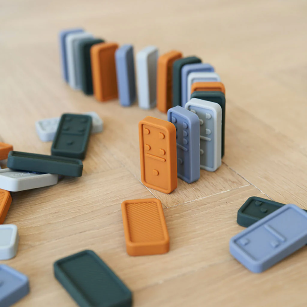En silicone, les 28 pièces de domino sont très faciles à attraper pour les petits. Fournies dans une boîte de rangement.