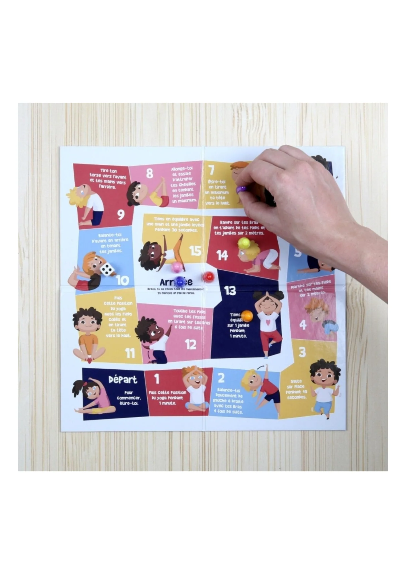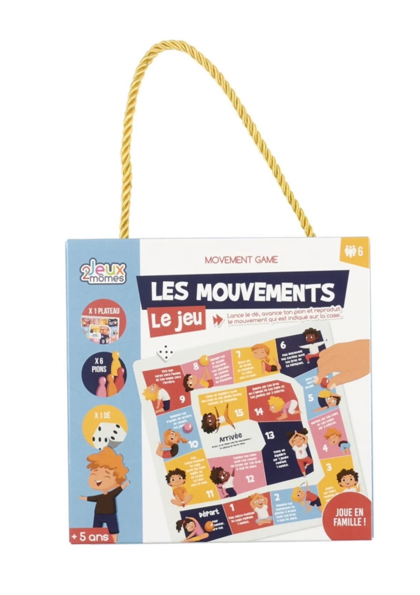 Le but du jeu : lancer le dé, avancer son pion et reproduire le mouvement correspondant à la case jusqu’à arriver le premier sur la case arrivée.