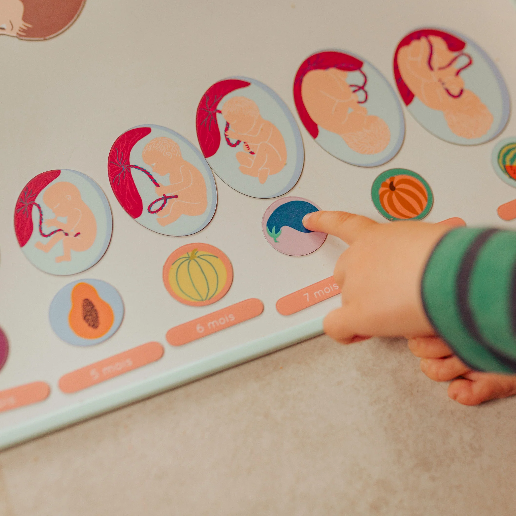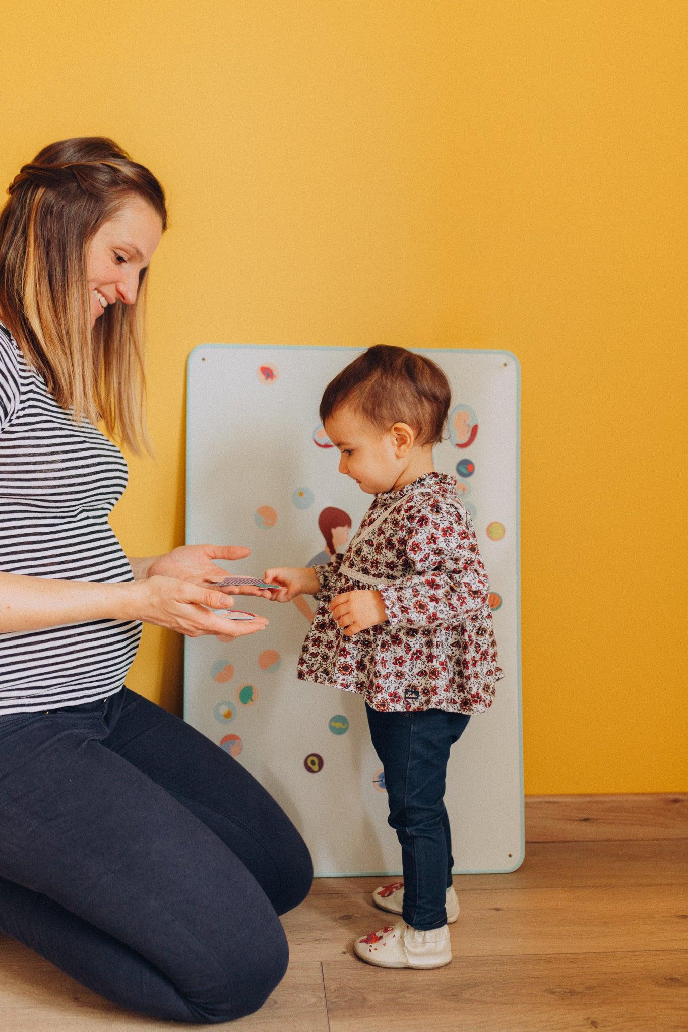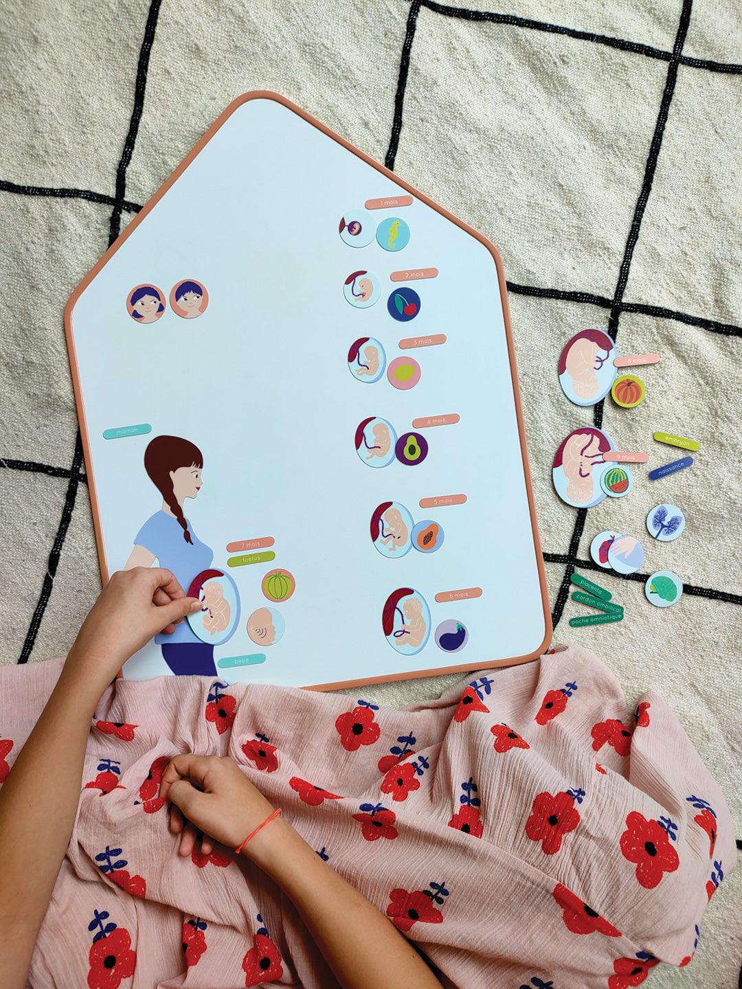 Une collection de magnets pédagogiques et ludiques pour expliquer aux enfants les étapes de la grossesse mois après mois, le développement du bébé, sa taille, son poids et sa relation avec le monde extérieur.