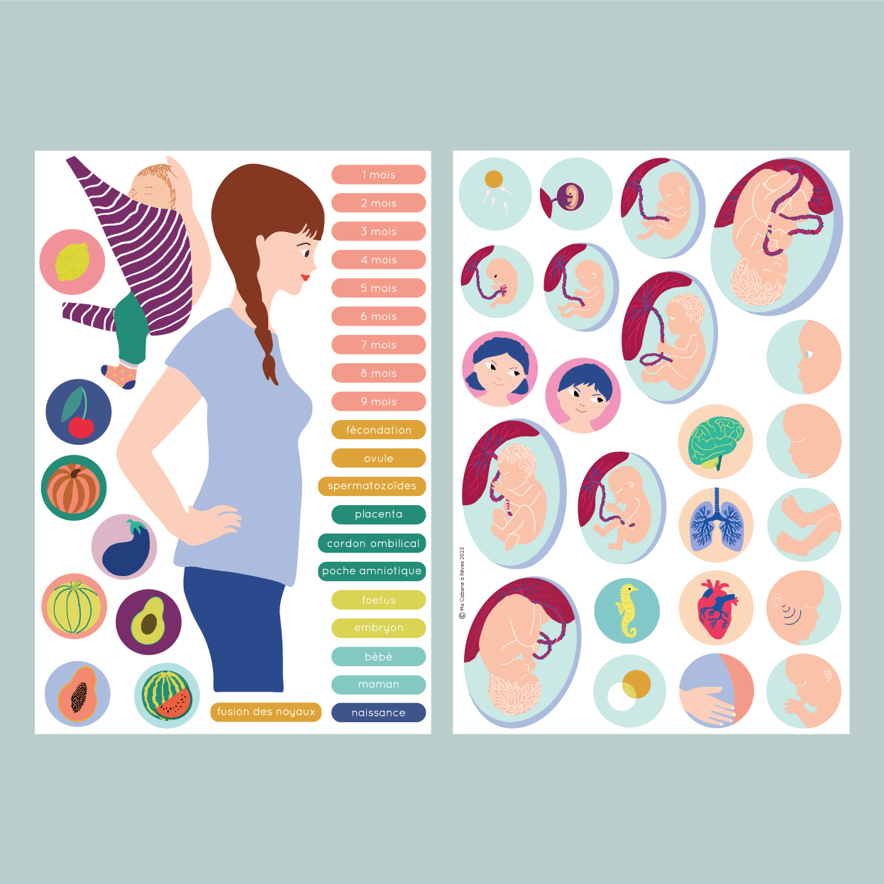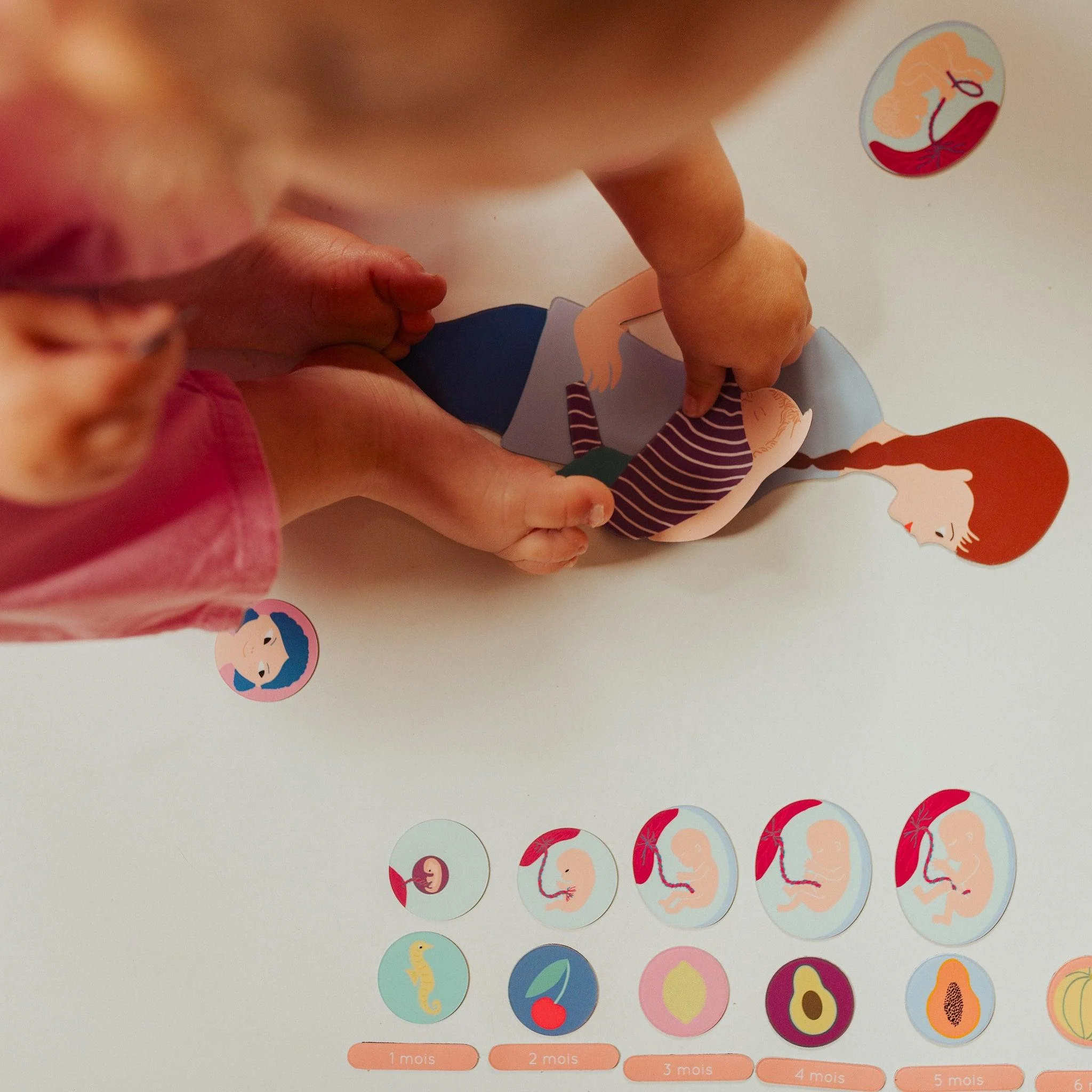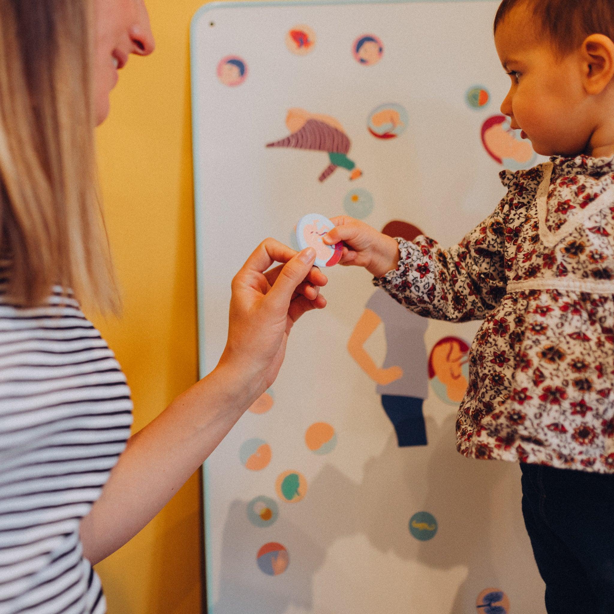 Une collection de magnets pédagogiques et ludiques pour expliquer aux enfants les étapes de la grossesse mois après mois, le développement du bébé, sa taille, son poids et sa relation avec le monde extérieur.