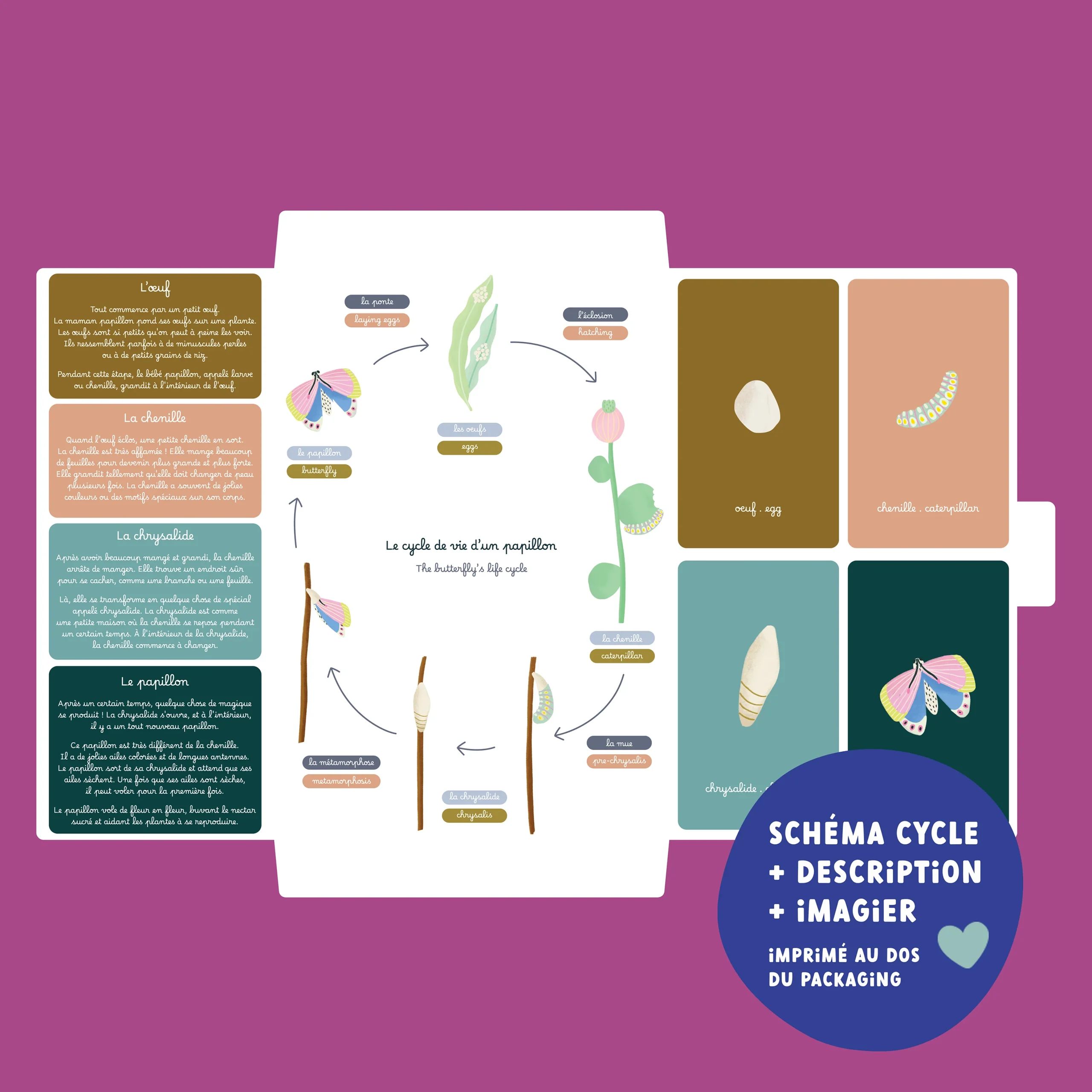 4 cartes imagier et 4 cartes explicatives détaillant les différentes étapes de la métamorphose en français.