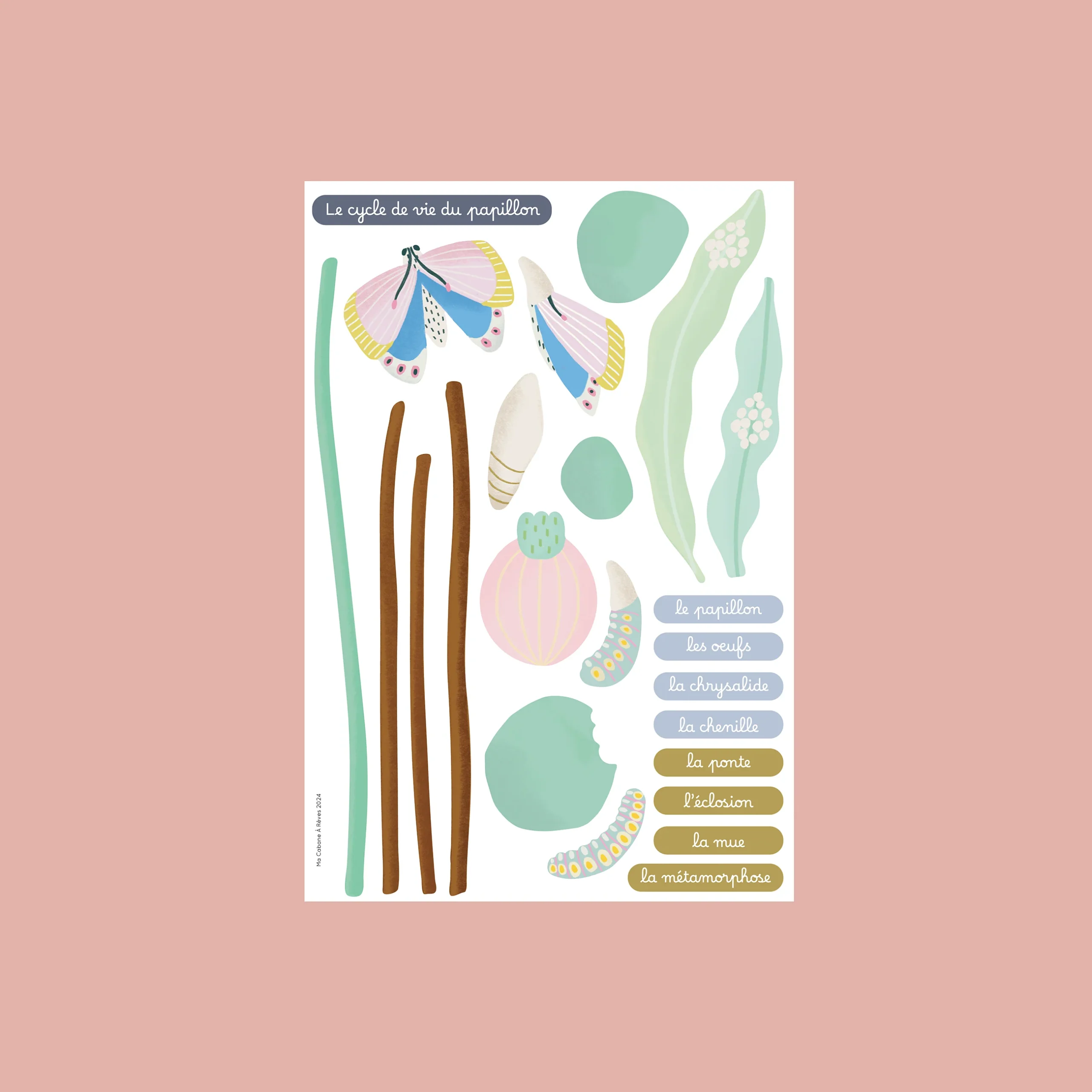 1 schéma des différents stades de la métamorphose du papillon en français et anglais