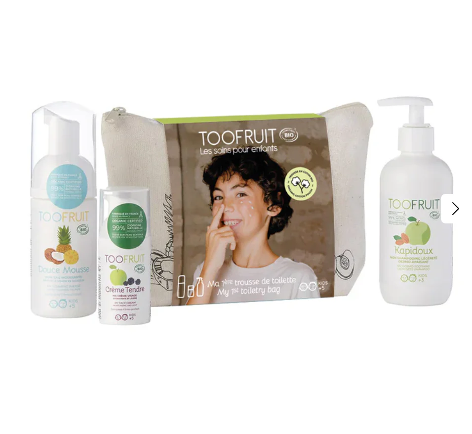 Idéal pour apprendre dès le plus jeune âge les bons gestes d’hygiène et de soin. Ma 1ère trousse de toilette TOOFRUIT contient des produits certifiés bio pour enfants dans une jolie trousse en coton bio GOTS pour que vos enfants puisse les emmener partout avec eux (en vacances, chez des amis, chez les grands-parents…) !