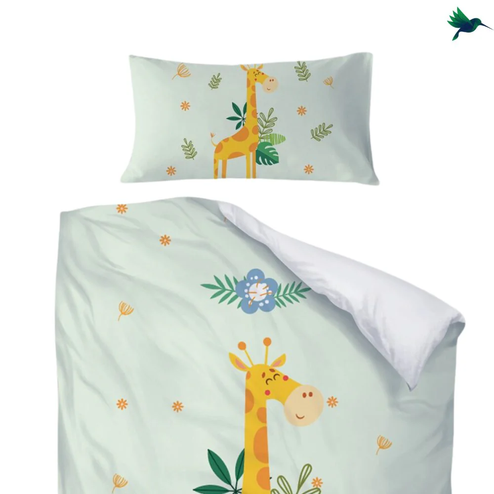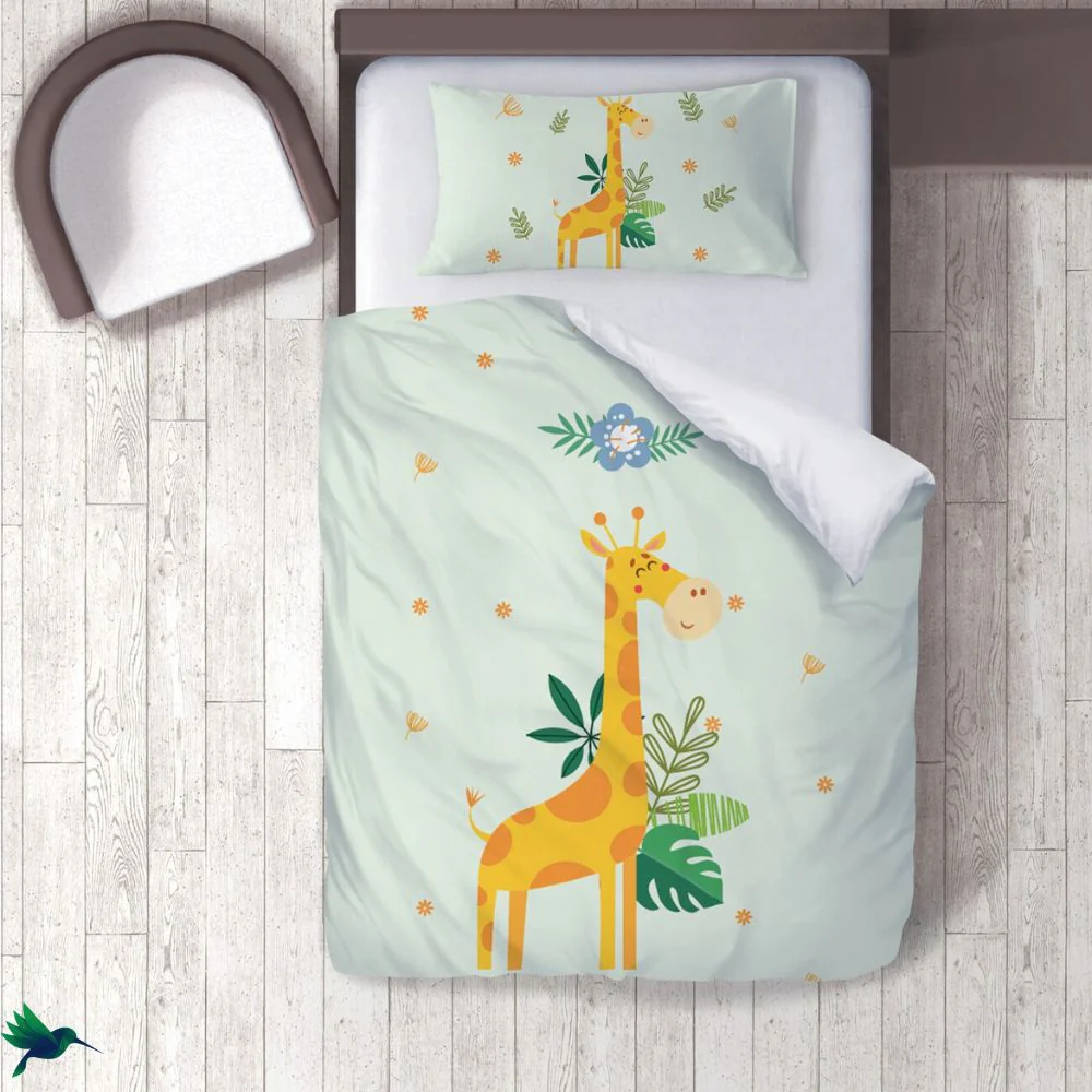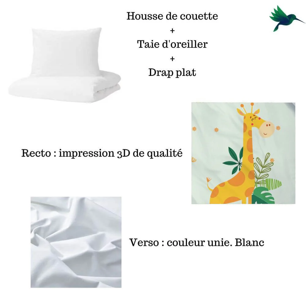 Égayez la chambre de votre enfant en y installant une parure de lit spéciale. Voici la parure de lit Jungle qui a tout pour plaire. Il s’agit d’un trio « housse de couette + taie d’oreiller + drap » aux motifs sublimes. En effet, coloré d’une magnifique couleur vert pâle, il est décoré par le dessin d’une girafe avec en arrière-plan une légère végétation.
