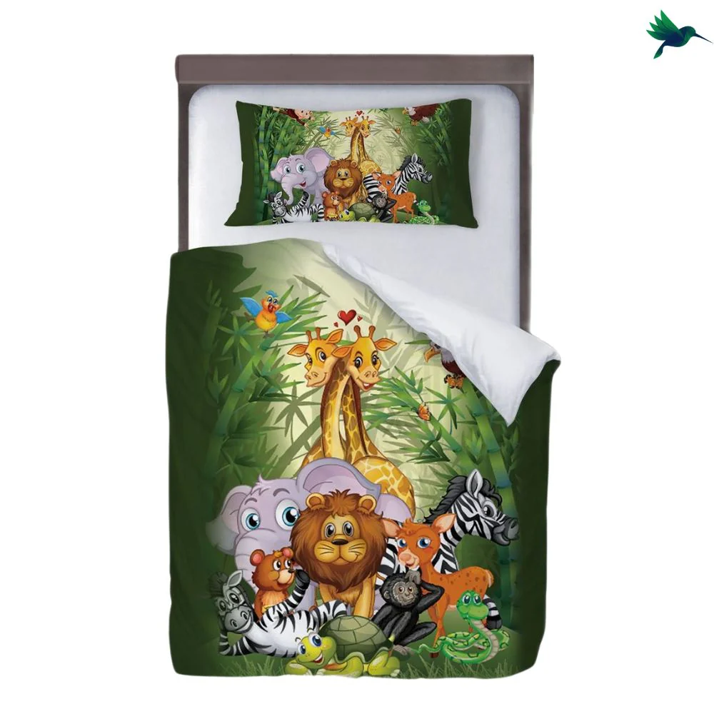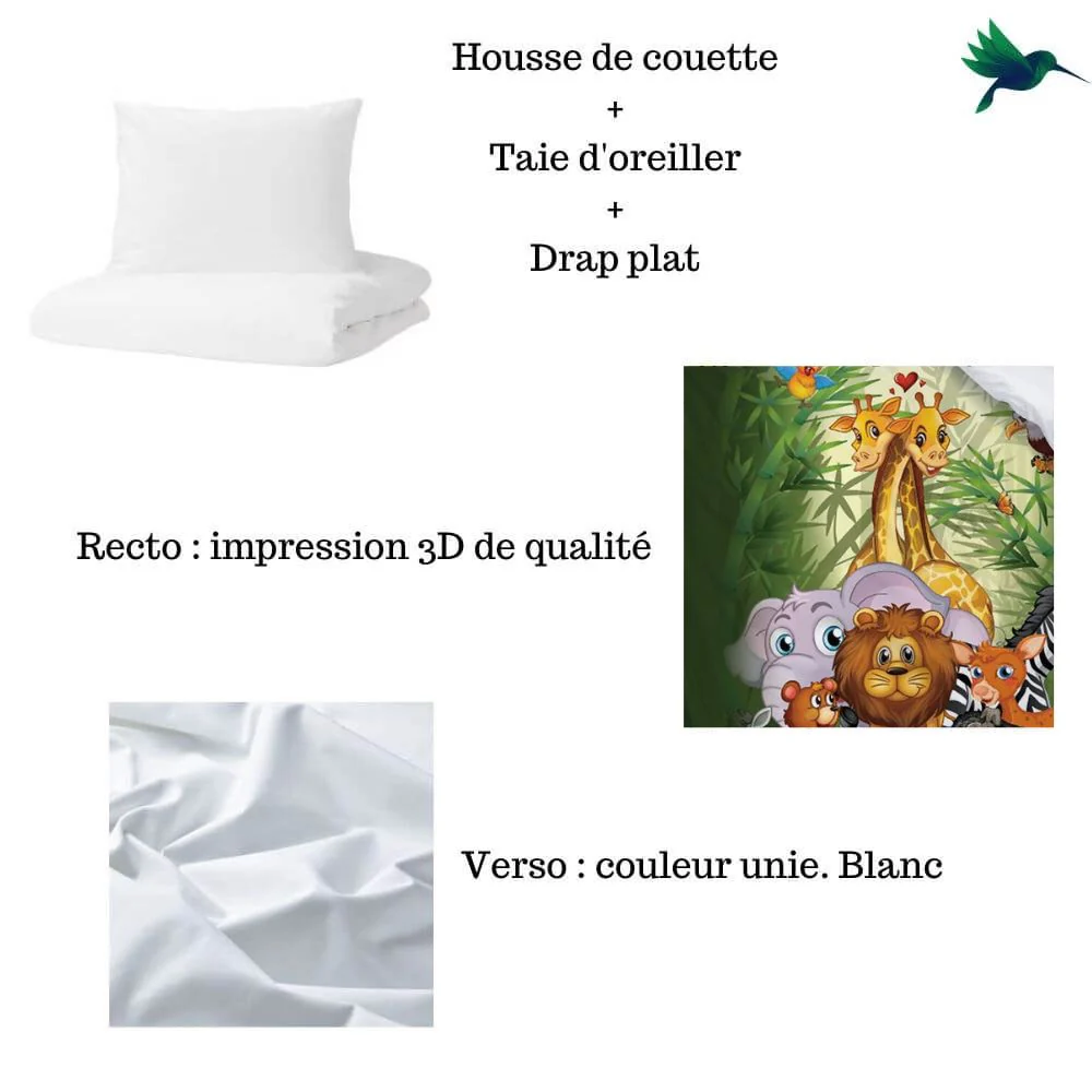 Décorez le lit de votre enfant avec cette sublime parure. Il s’agit d’une literie avec un motif Jungle et ces Animaux Cette housse de couette est sublimée par des illustrations d’animaux et de végétation de la jungle. Cette décoration de lit ajoute une touche exotique à la chambre de votre enfant. Il s’agit d’un ensemble de housse de couette, taie d’oreiller et drap, qui promet un sommeil confortable et réparateur pour votre petit (fille ou garçon).