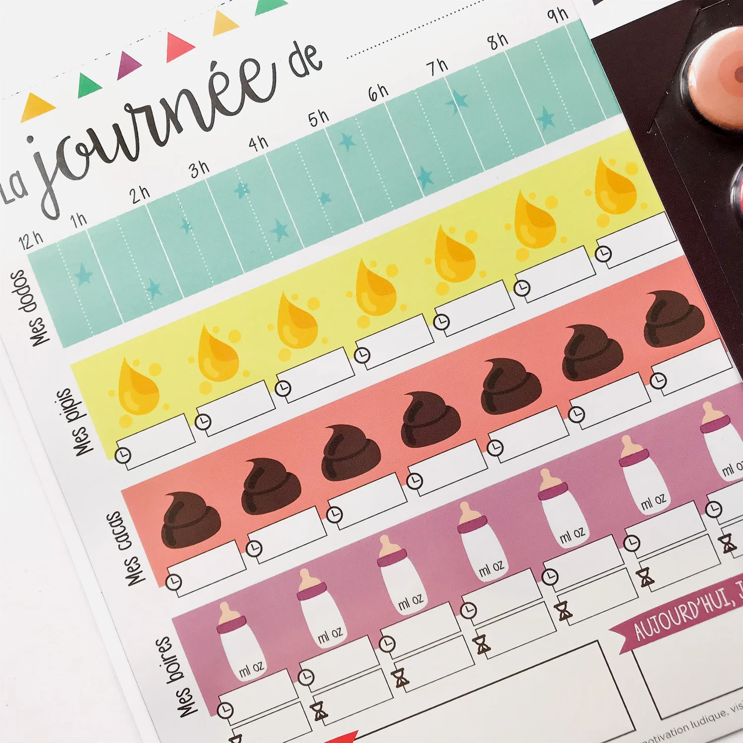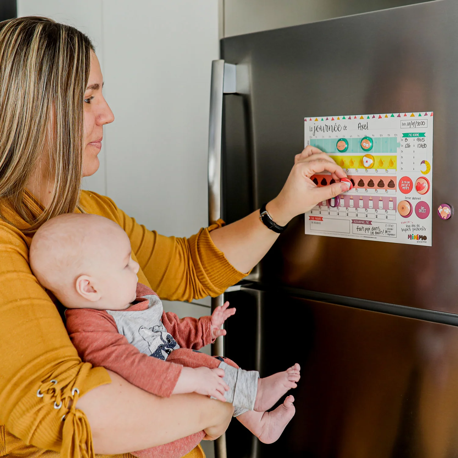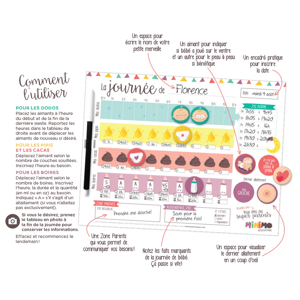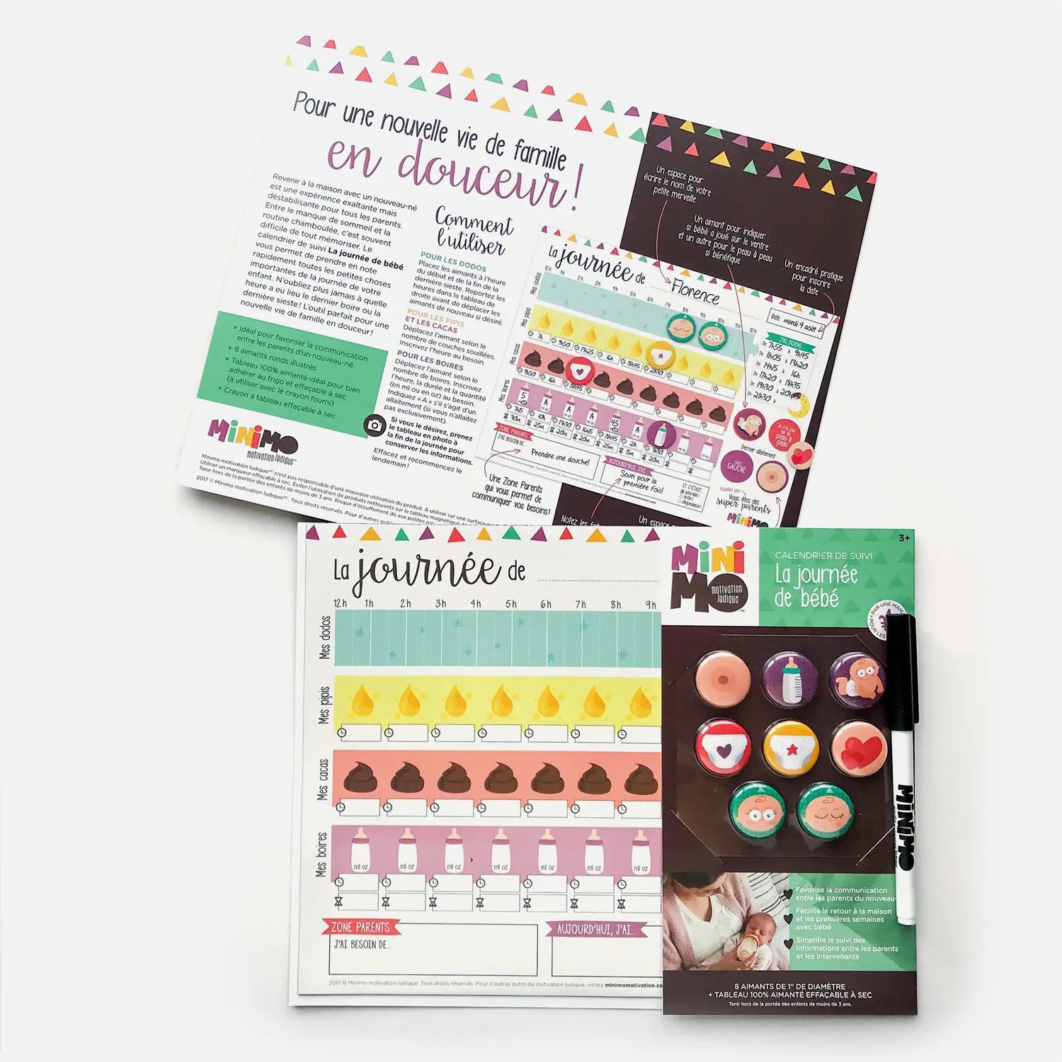Revenir à la maison avec un nouveau-né est une expérience exaltante mais déstabilisante pour tous les parents. Entre le manque de sommeil et la routine chamboulée, c’est souvent difficile de tout mémoriser. Le calendrier de suivi La journée de bébé de Minimo Motivation Ludique te permet de prendre en note rapidement toutes les petites choses importantes de la journée de ton enfant. N’oublie plus jamais à quelle heure a eu lieu le dernier boire ou la dernière sieste! L’outil parfait pour une nouvelle vie de famille en douceur!
