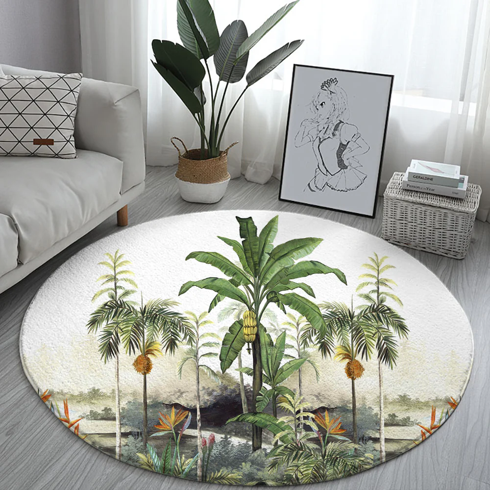 Avec son design rond et son motif de paysage exotique comprenant des palmiers majestueux, des bananiers luxuriants et d’autres éléments inspirés de la jungle tropicale, ce tapis est un véritable appel à l’évasion.
