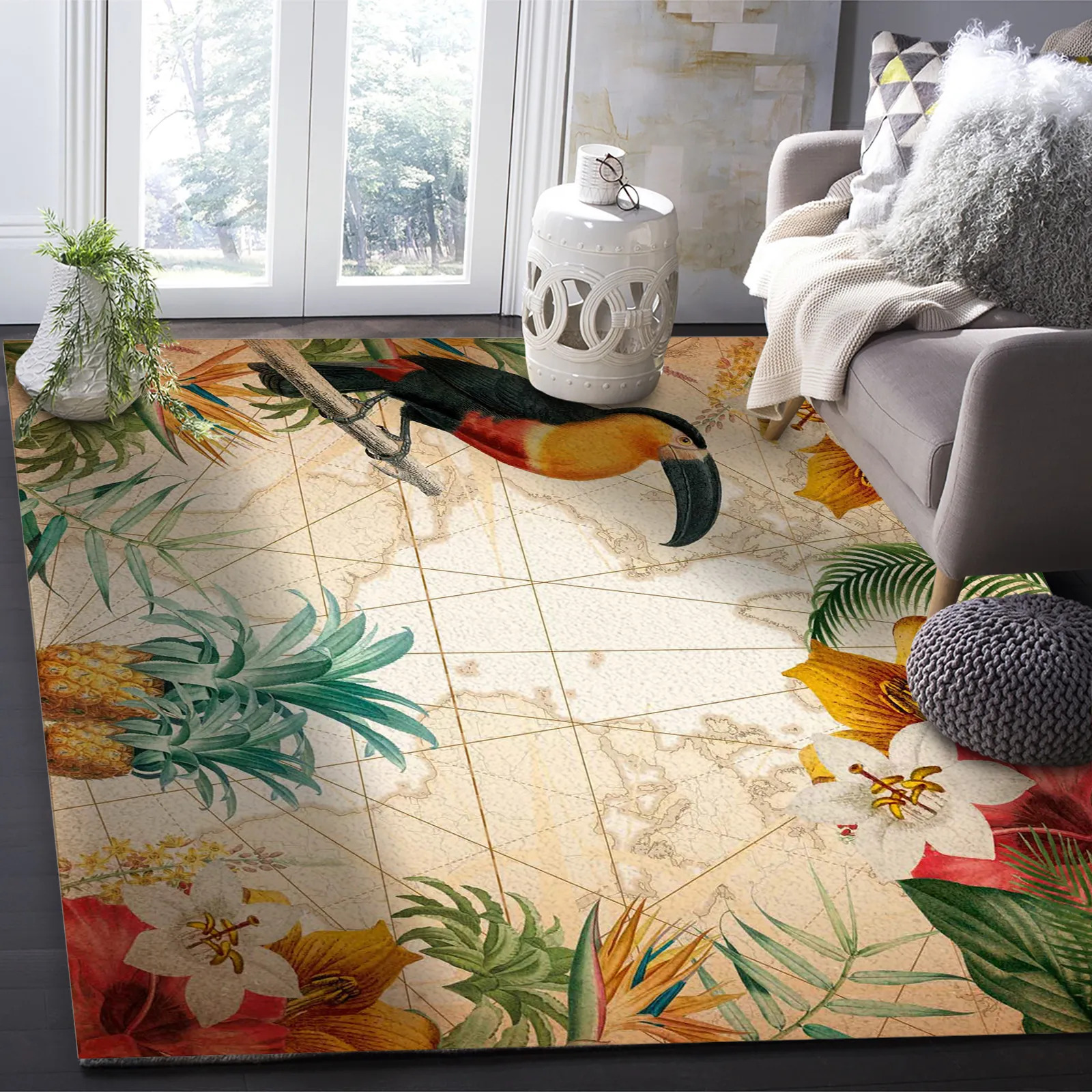 Motif dépaysant: Notre tapis est orné de motifs uniques: Toucan, ananas, fleurs exotiques luxuriantes… Une carte du monde en arrière-plan évoque l’appel à l’exploration, au voyage. Il créera un point focal saisissant dans n’importe quelle pièce.