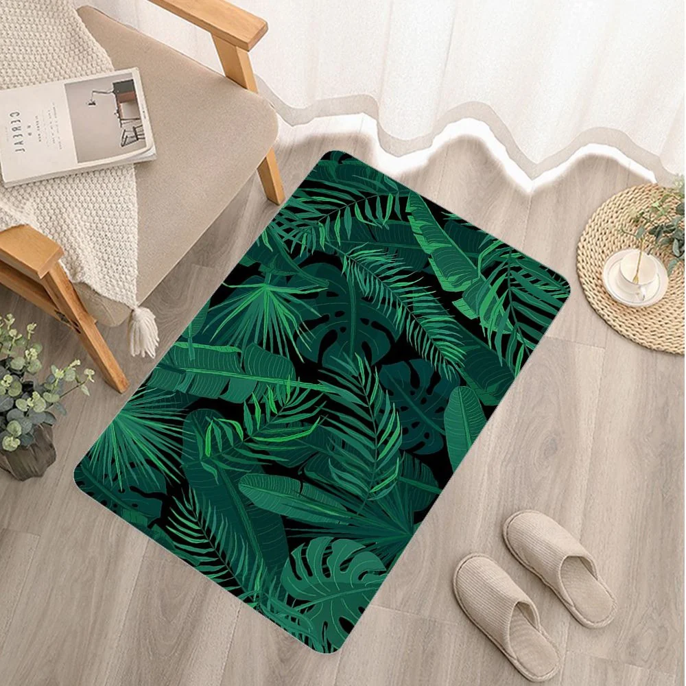 Voici un paillasson qui représente bien la flore de la jungle, avec un feuillage dense et varié. Il est orné de motifs de feuilles vertes avec un fond noir.