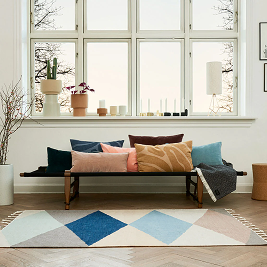 Un tapis graphique, scandinave aux couleurs apaisantes. Parfait dans une chambre ou un salon. En laine et coton.