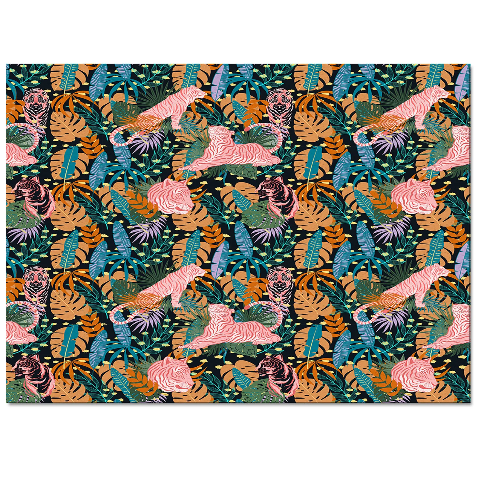 Motif Tigre Rose : Ce tapis arbore un motif de tigre rose majestueux au milieu d’un feuillage luxuriant. Le tigre rose ajoute une dimension unique à votre décoration intérieure, évoquant à la fois la puissance et la délicatesse de la nature.