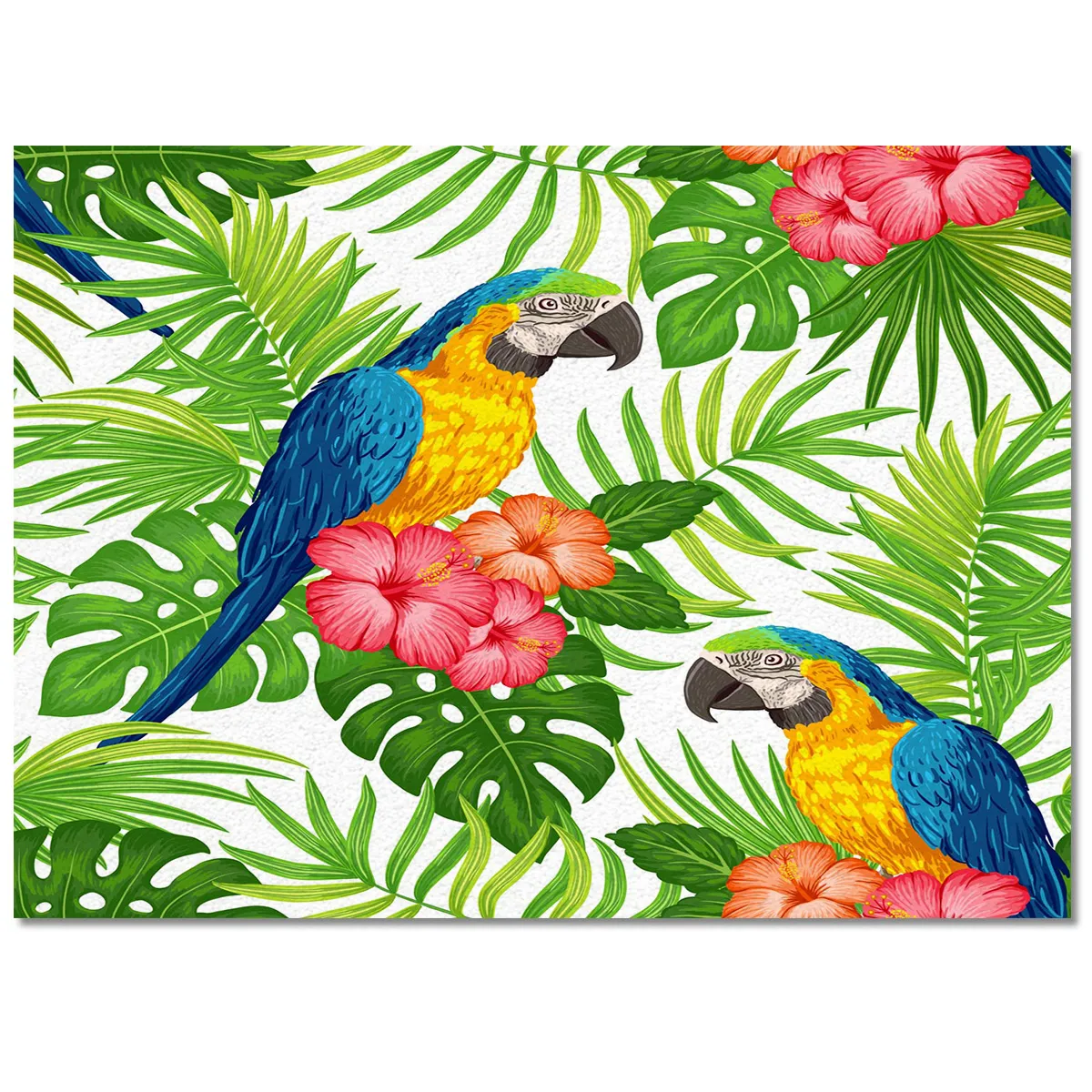 Transformez votre espace en un paradis tropical avec notre Tapis. Il évoque l’exotisme avec son motif luxuriant de feuillage tropical, d’hibiscus en fleurs et la présence majestueuse de deux perroquets colorés.
