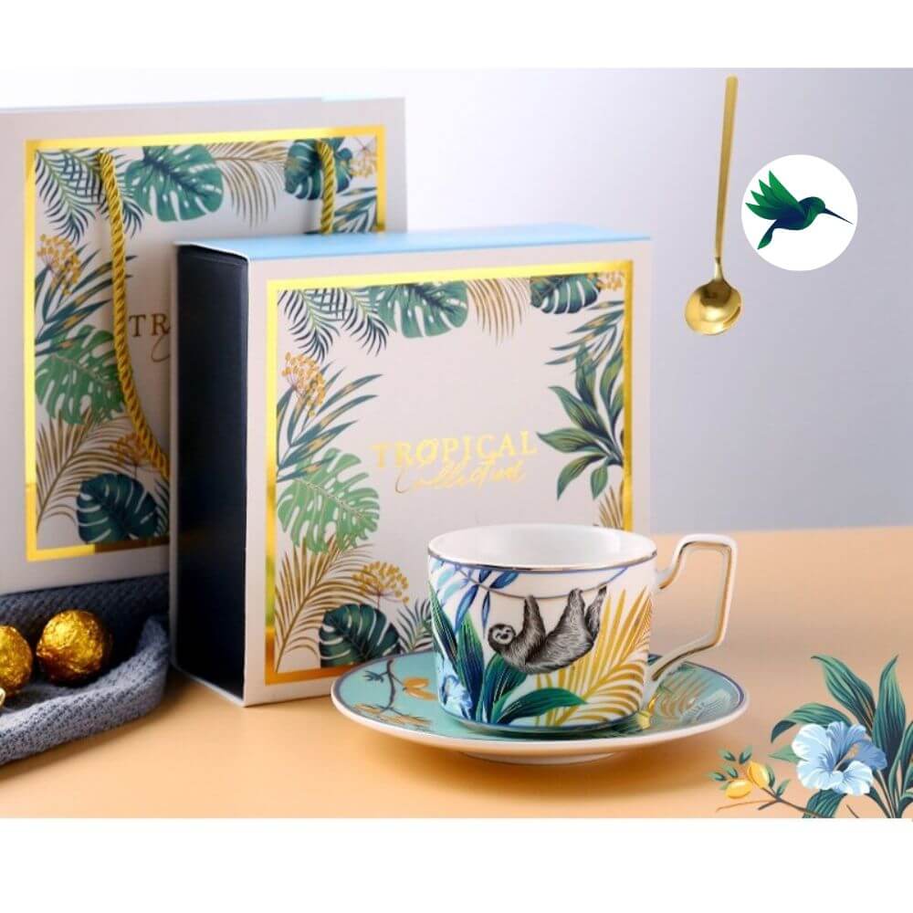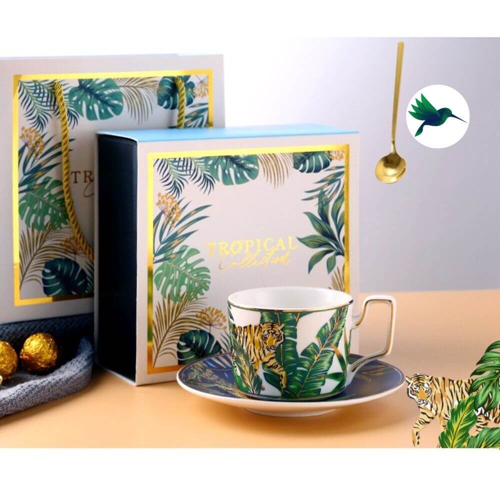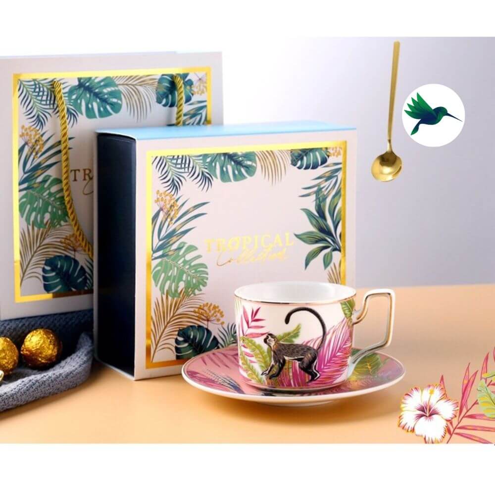 Notre collection de Tasse Jungle devrait vous plaire. Vous recevrez dans un coffret: une tasse + une soucoupe + une cuillère. Voici les motifs disponibles : Toucan, Papillon, Singe, Tigre, Paresseux, Léopard. Chaque tasse arbore un animal avec des teintes différentes et un feuillage de jungle tropicale.