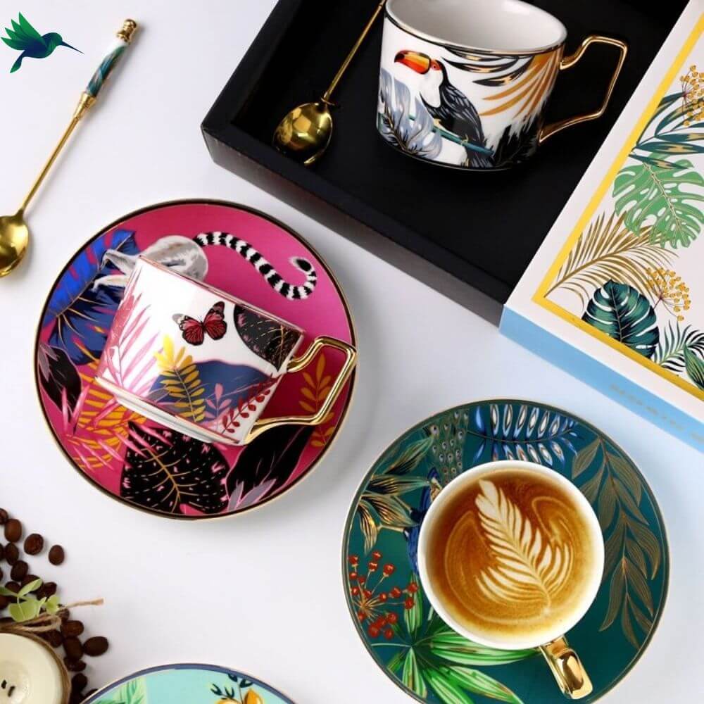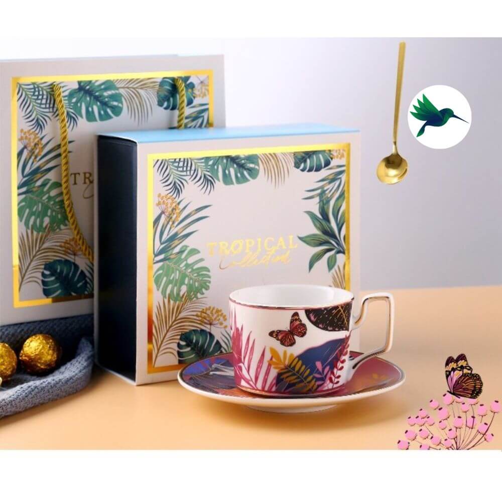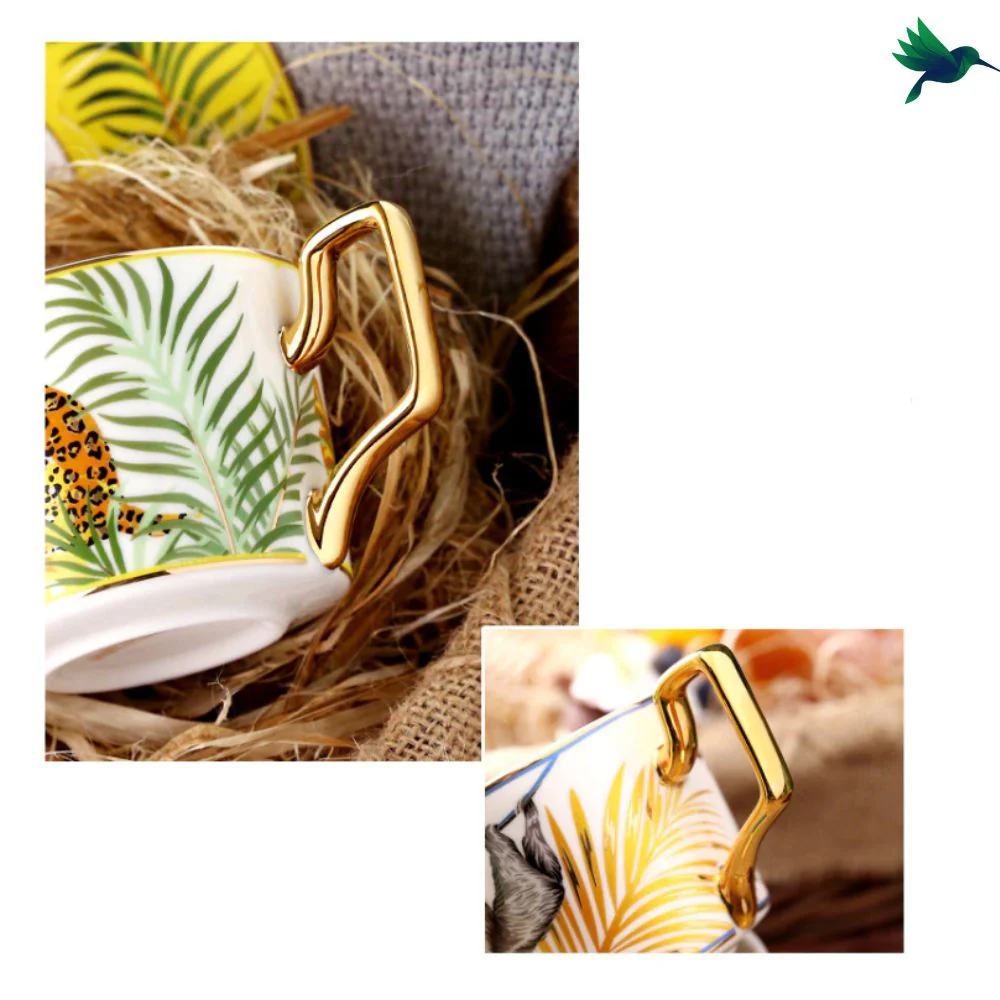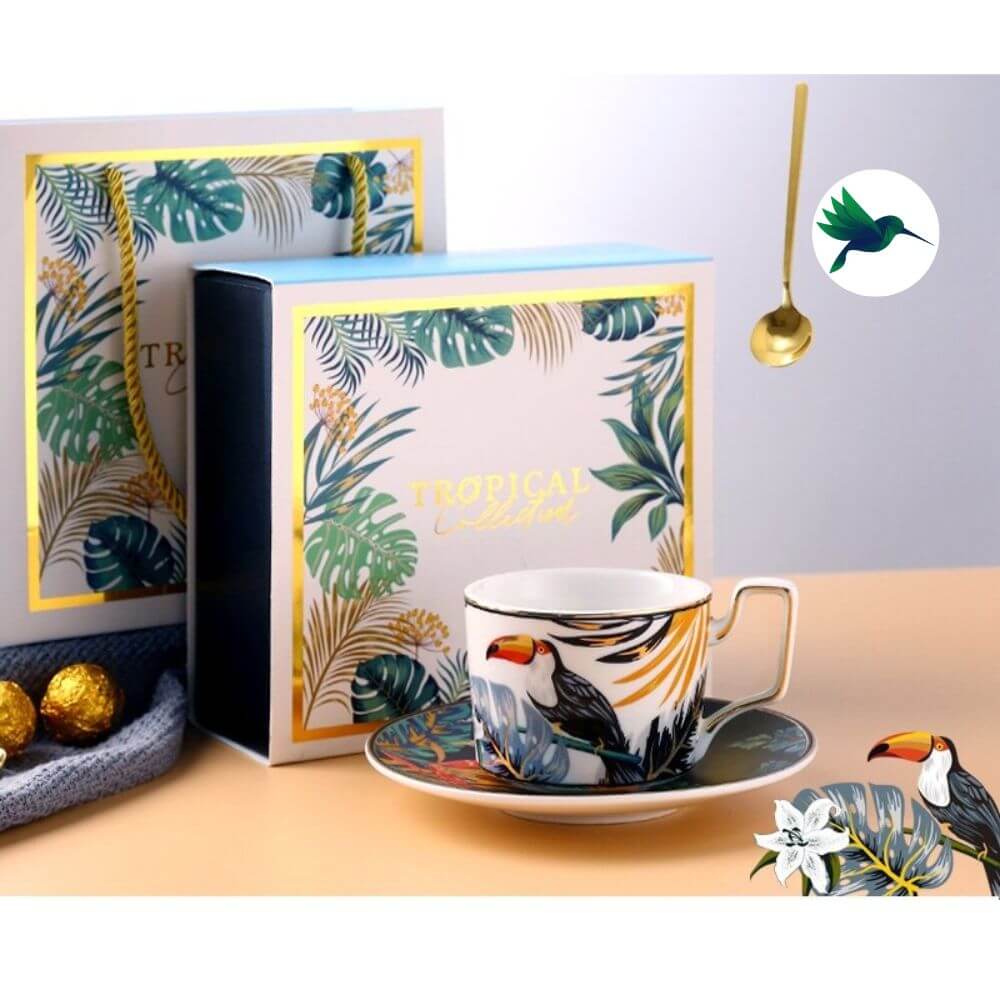Notre collection de Tasse Jungle devrait vous plaire. Vous recevrez dans un coffret: une tasse + une soucoupe + une cuillère. Voici les motifs disponibles : Toucan, Papillon, Singe, Tigre, Paresseux, Léopard. Chaque tasse arbore un animal avec des teintes différentes et un feuillage de jungle tropicale.